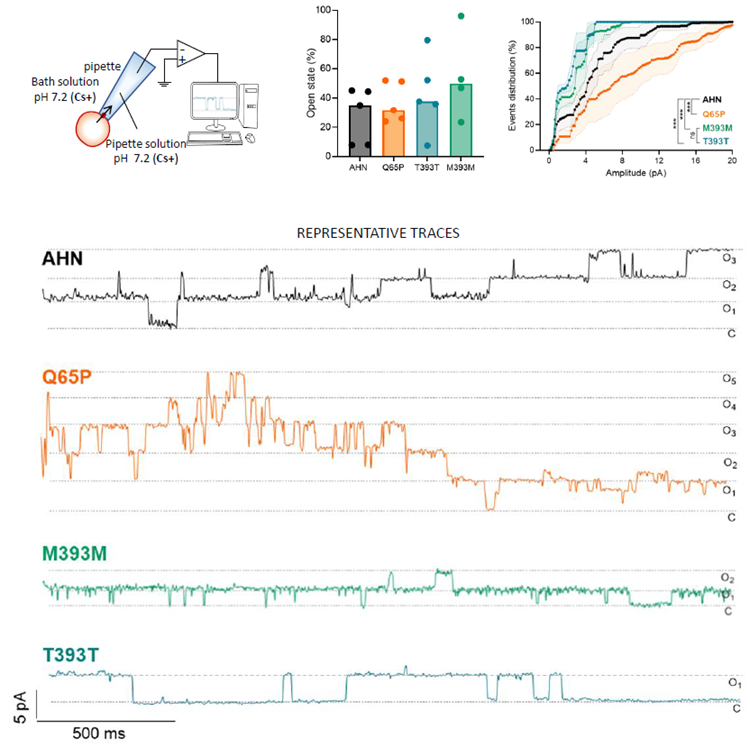• Preliminary data (n=5) on single-channel recordings indicate a higher number of channels in Q65P compared to the other cell lines, while open probability and dwelling time parameters are higher in M393M.