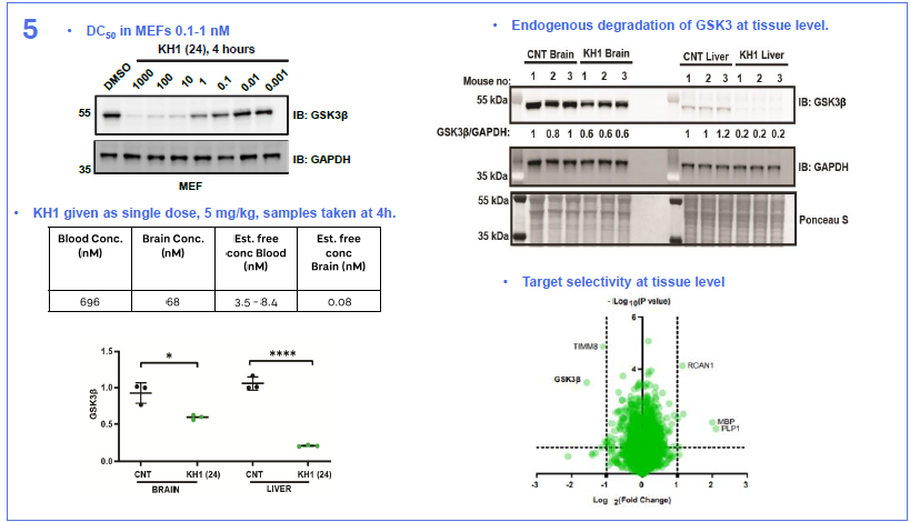 In this study, we present a novel library synthesis and screening approach, that was able to identify an in vivo active bifunctional degrader of chemical probe quality directly coming from the initial screen. We started by establishing use of linker reagents that can be selectively conjugated in high conversion, with two different reaction types at either end, so-called orthogonally reactive linkers. Next, we took Direct-to-Biology approach to test our library in a GSK3β-HiBiT knock-in HEK293 cell line, generating full dose-response curves for all compounds. Once all building blocks and a suitable screening assay were available, we were able to complete the full synthesis and screening workflow in 5 days. We identified two molecules, KH1 (24) and KH2 (26) that showed DC50 values in the picomolar to single digit nanomolar range and exquisite specificity for degrading both GSK3 paralogs with no other significantly degraded proteins identified. Finally, we discovered that KH1 (24), following a single 5 mg/kg i.v. dose was able, within 4 hours, to almost completely remove GSK3β from the liver with partial degradation also observed in mouse brain. Our data support that this is achieved via a combination of moderate brain penetration and potent and rapid degradation kinetics. This study shows that the inherent pharmacokinetic/pharmacodynamic disconnect of PROTACs can be leveraged to avoid the requirement for high and prolonged CNS exposure, which would be required for inhibitors, to achieve on-target modulation in the brain. Whilst an opportunity for some, this may also act as an important warning to those who require avoiding on-target activity in the brain. We hope that the orthogonally reactive linker synthesis and screening approach exemplified here can provide a generalisable strategy to accelerate bifunctional probe discovery and therapeutic concept generation and a benchmark for CNS PROTAC discovery.