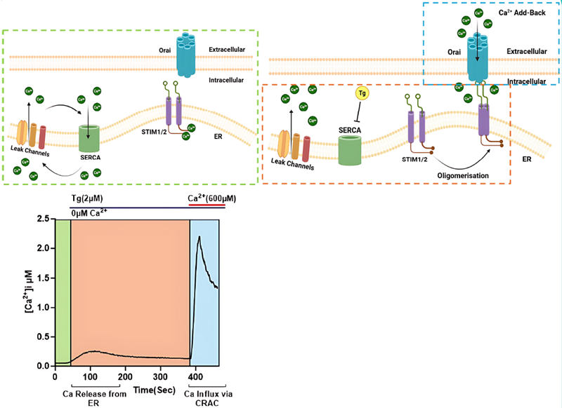 - Store depletion: SERCA inhibition by thapsigargin (Tg) leads to ER Ca2+ depletion, activating STIM1/2, which gate Orai1 channels.