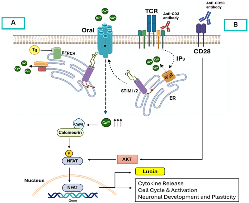 Figure 4. Schematic representation of NFAT pathway activation and reporter assay principle. TCR/CD28 activation (A) or Tg-induced ER Ca2+ depletion (B) triggers SOCE, activating calcineurin–NFAT signalling. NFAT translocates to the nucleus and induces Lucia reporter expression, measured as luminescence. Image Credit: Image courtesy of Aida Ashrafzadeh et al., in partnership with ELRIG (UK) Ltd.