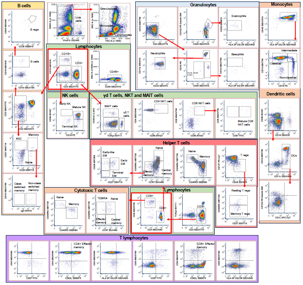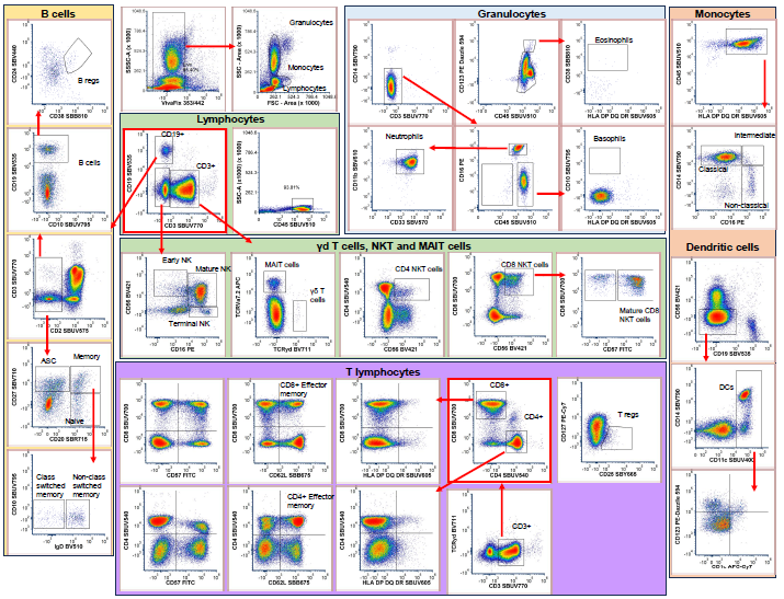 Fig. 4. Human immunophenotyping panel acquired on a 5L Sony ID7000. Human peripheral blood was stained with a 32-color antibody panel (Table 1). CD45RASBY720 was accidentally omitted, therefore naïve and memory T cell populations could not be identified in this panel. Bio-Rad gratefully acknowledges the assistance of Jamie Evans, Flow Cytometry Core Facility Manager, Division of Medicine, Rayne Building UCL for providing access and assistance with their ID7000. Image Credit: Image courtesy of Sharon Sanderson et al., in partnership with ELRIG (UK) Ltd.