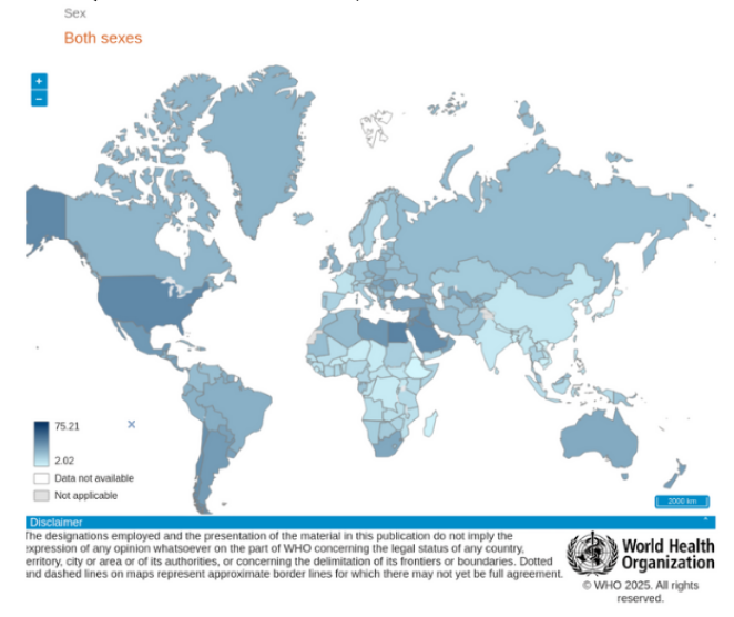 • Obesity is a multifactorial metabolic disease and a major global public health challenge currently affecting over one billion people worldwide. Its prevalence varies by region, as shown in the WHO map below (2022 data).