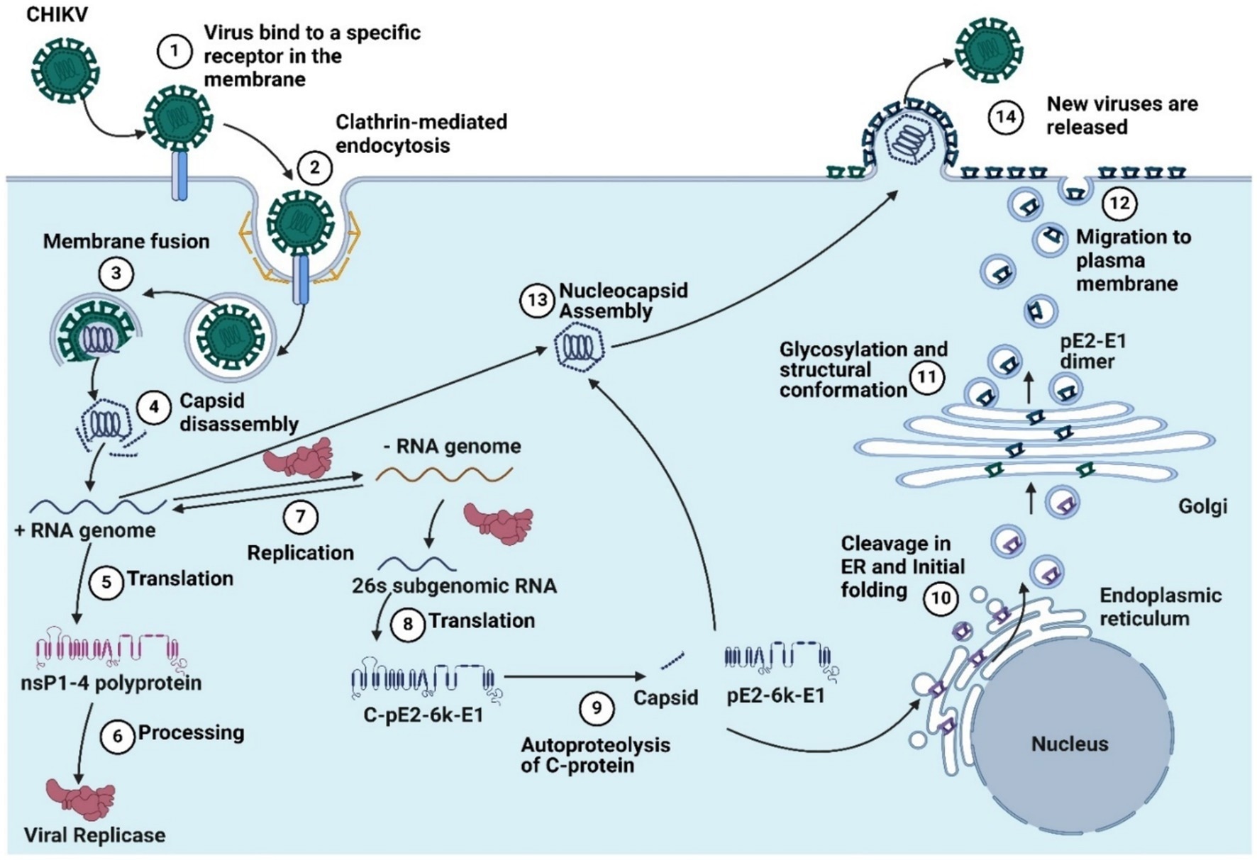 The chikungunya virus replication cycle includes (1) virus binding to a specific receptor in the membrane, (2) clathrin-mediated endocytosis, (3) membrane fusion, (4) capsid disassembly, (5) translation, (6) processing, (7) replication, (8) 26’s subgenomic RNA translation, (9) autoproteolysis, (10) cleavage in the endoplastic reticulum and initial folding, and (11). Glycosylation and structural conformation, (12) migration to the plasma membrane, (13) nucleocapsid assembly, and (14) the release of new viruses (Created by using Biorender.com).[9]The chikungunya virus replication cycle includes (1) virus binding to a specific receptor in the membrane, (2) clathrin-mediated endocytosis, (3) membrane fusion, (4) capsid disassembly, (5) translation, (6) processing, (7) replication, (8) 26’s subgenomic RNA translation, (9) autoproteolysis, (10) cleavage in the endoplastic reticulum and initial folding, and (11). Glycosylation and structural conformation, (12) migration to the plasma membrane, (13) nucleocapsid assembly, and (14) the release of new viruses (Created by using Biorender.com).[9]