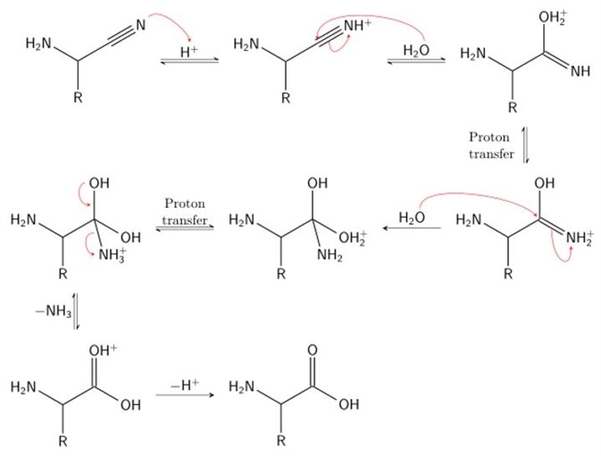 - Stage 2: hydrolysis of the α-amino nitrile to produce an α-amino acid.