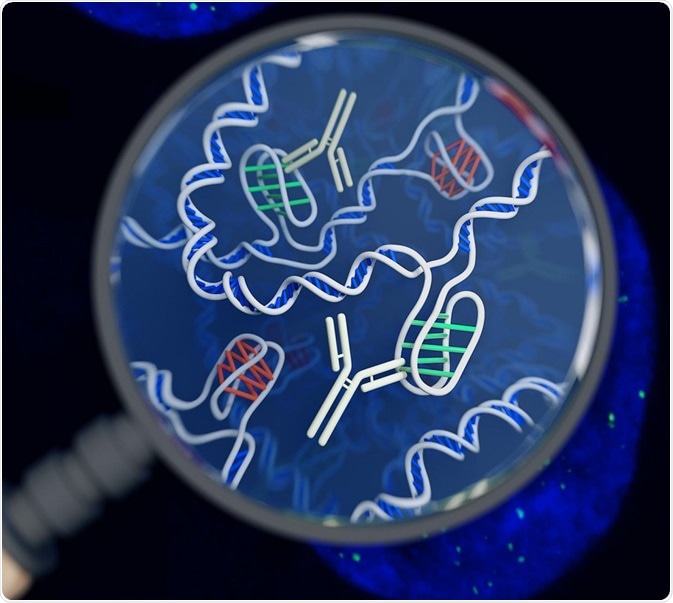 An artist's impression of the i-motif DNA structure inside cells, along with the antibody-based tool used to detect it. Image Credit: Chris Hammang / Shutterstock