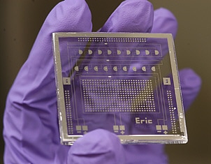Simone joined Wang's lab team in January 2003 and used a Provost's Undergraduate Research Award grant from the university to spend much of last summer working on his project. "The chip has tiny wires, each about one-fifth the diameter of a human hair, embedded in a circular pattern," Simone said. "When it's connected to a power source, it allows us to generate an electric field that can transport molecules to a designated area for study."