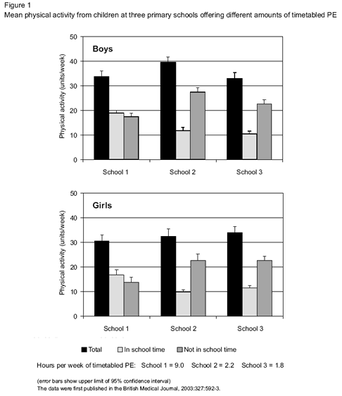 An independent study within the EarlyBird Programme was carried out to assess the impact of different provision for physical education within schools.11 Two hundred and fifteen healthy children (120 boys and 95 girls aged 7.0 - 10.5y, mean 9.0 years) from three schools with widely different curricular opportunity for physical education were tested. School 1, a private preparatory school with some boarding pupils, had extensive facilities and 9.0 hours a week of physical education in the curriculum. School 2, a village school awarded Activemark gold status for its focus on physical activity, offered 2.2 hours of timetabled physical education a week. School 3, an inner city school with no particular provision, offered 1.8 hours of physical education a week. Analysis of variance was used to compare means between schools and the least significant difference p-values are quoted. The study was conducted to establish whether the provision of physical education in the curriculum makes a significant difference to a child's overall weekly activity.