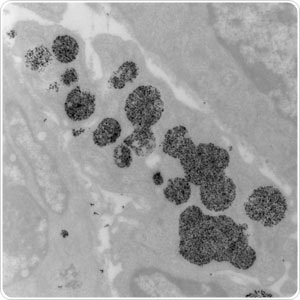Shown here at 9900x magnification, tumor cells readily take up magnetic nanoparticles (black objects). When a tumor containing nanoparticles is exposed to an alternating magnetic field, the nanoparticles will heat and kill the tumor cells.
