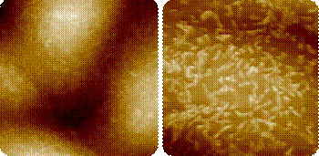 Figure 1. Bioscope Resolve with PeakForce Tapping now enables high-resolution imaging of microvilli on living cells. (25 µm and 10 µm images of MDCK cells captured at 1 kHz PeakForce QNM. Images obtained by Dr. Hermann Schillers, University of Munster.)