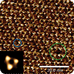 Figure 3. PeakForce Tapping image of the bacteriorhodopsin (bR) membrane protein lattice structure taken on an inverted optical microscope. The inset shows a single particle averaging of the bR trimer. The green circle shows a single lattice defect. The blue circle shows the lattice substructures (Z scale = 0.6 nm).
