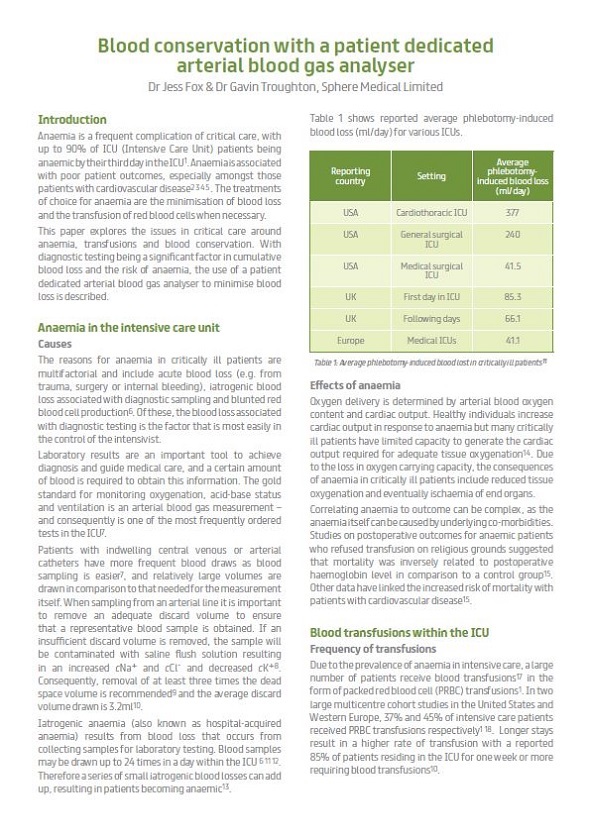 Sphere Medical, innovator in critical care monitoring and diagnostics equipment, has published a white paper exploring the issues in critical care around anaemia, transfusions and blood conservation. Entitled ‘Blood conservation with a patient dedicated arterial blood gas analyser’, the new white paper is available for download from Sphere’s online clinical resource centre.