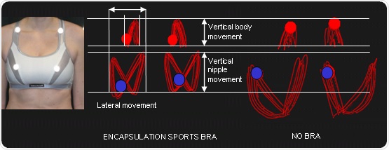Studies have shown that breasts move during exercise by up to 21cms in a figure of eight pattern, causing pain for an estimated three-quarters of women. A sports bra can reduce breast movement by a similar amount for AA cup to G-cup breasts. If breast movement is not reduced, there is a risk of irreparably damaging the fragile Cooper’s ligaments, resulting in breast sag.