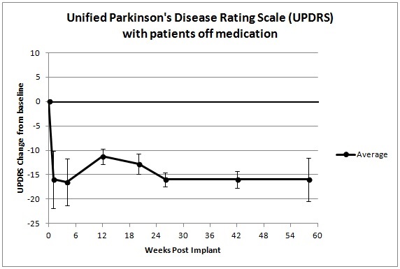 Moreover, as the chart below shows, after 58 weeks there is a clinically and statistically significant improvement in all the patients’ neurological score from their pre-implant baseline.