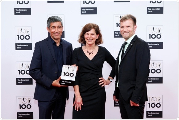 Popular German Science Journalist Ranga Yogeshwar hands over the TOP 100 award to Anke Bördgen and Dr. Marc Diener (© KD Busch/compamedia)