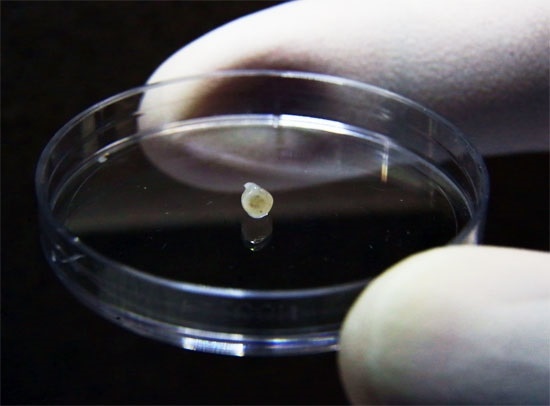 A midbrain organoid in a petri dish. The black pigment is neuromelanin, a hallmark of the human midbrain. Copyright: A*STAR's Genome Institute of Singapore