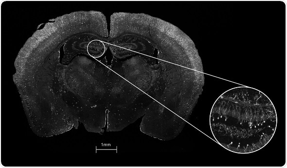 Figure 1. Neurons activated during stress test. Caliber ID's RS-G4 scanned and stitched 1050 fields to image this 12mm x 8mm brain section (0.5" x 0.25") in just 270 seconds (4.5 minutes), with confocal resolution and clarity (inset). Subject: Mouse Brain. Objective: 40x/1.30 oil immersion. Image courtesy of Boston Children's Hospital, D. Ehlinger and K. Commons.