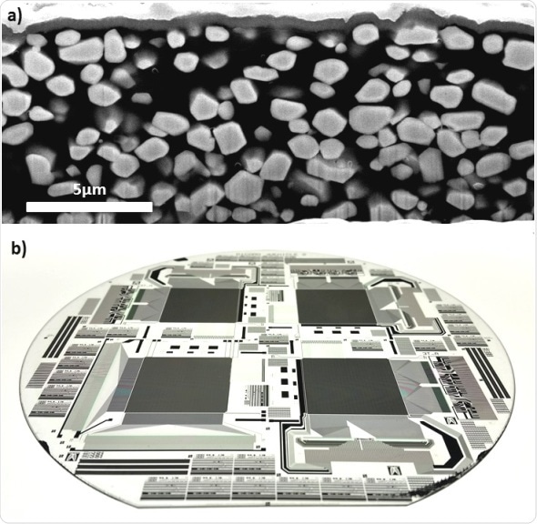 DICOMO 5μm view of (top) Scintillating micro-particles (white) embedded in an organic semiconducting bulk (dark) and (below) Active pixel metal-oxide backplane.