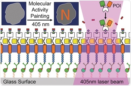 The plasma membrane is a tight lipid barrier surrounding the cell. Membrane proteins control the influx and efflux of water, ions, proteins, and other compounds. Extracellular signals are transduced by receptors through the membrane to trigger intracellular processes like cell movement or differentiation. The visualization of such events at a molecular level is still a major challenge, mainly because of the fast diffusion of the protein receptors in the plasma membrane. Therefore, the groups of Leif Dehmelt at the Max Planck Institute of Molecular Physiology and Yaowen Wu at the Chemicals Genomics Centre of the Max Planck Society, Germany, have developed a new technology termed "Molecular Activity Painting" (MAP), which combines immobilization and light-controlled activation: Artificial receptors tightly anchored on the cell substrate are furnished with a designed modular molecular system. One light pulse activates the modular building blocks, which can trigger localized signal cascades eventually leading to movements of the cytoskeleton. This technology makes the cellular response visible like a stroke of a brush on the membrane.