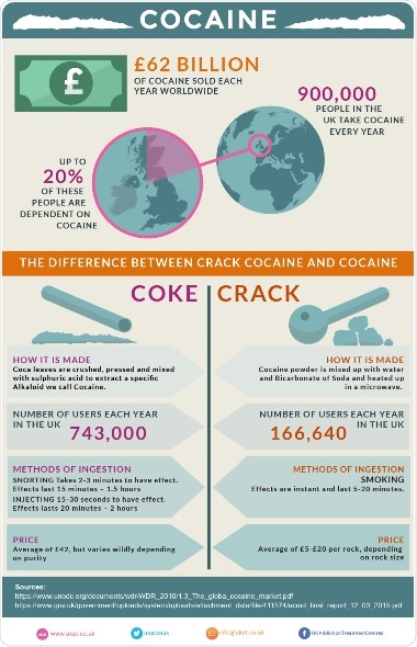 Last year, almost a million in the UK people snorted, dabbed, smoked or injected cocaine, making it the second most popular drug in the country, after cannabis. To many it may seem relatively harmless, for others it becomes a more regular habit. Research shows that up to 1/5 of all cocaine users develop an addiction.