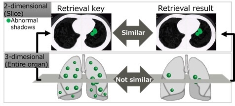 Technologies already exist to retrieve similar cases based on CT images for such diseases as early-stage lung cancer, in which abnormal shadows are concentrated in one place. For diffuse lung diseases like pneumonia, however, in which abnormal shadows are spread throughout the organ in all directions, it has been necessary for doctors to reconfirm three-dimensional similarities, increasing the time needed to reach a conclusion.