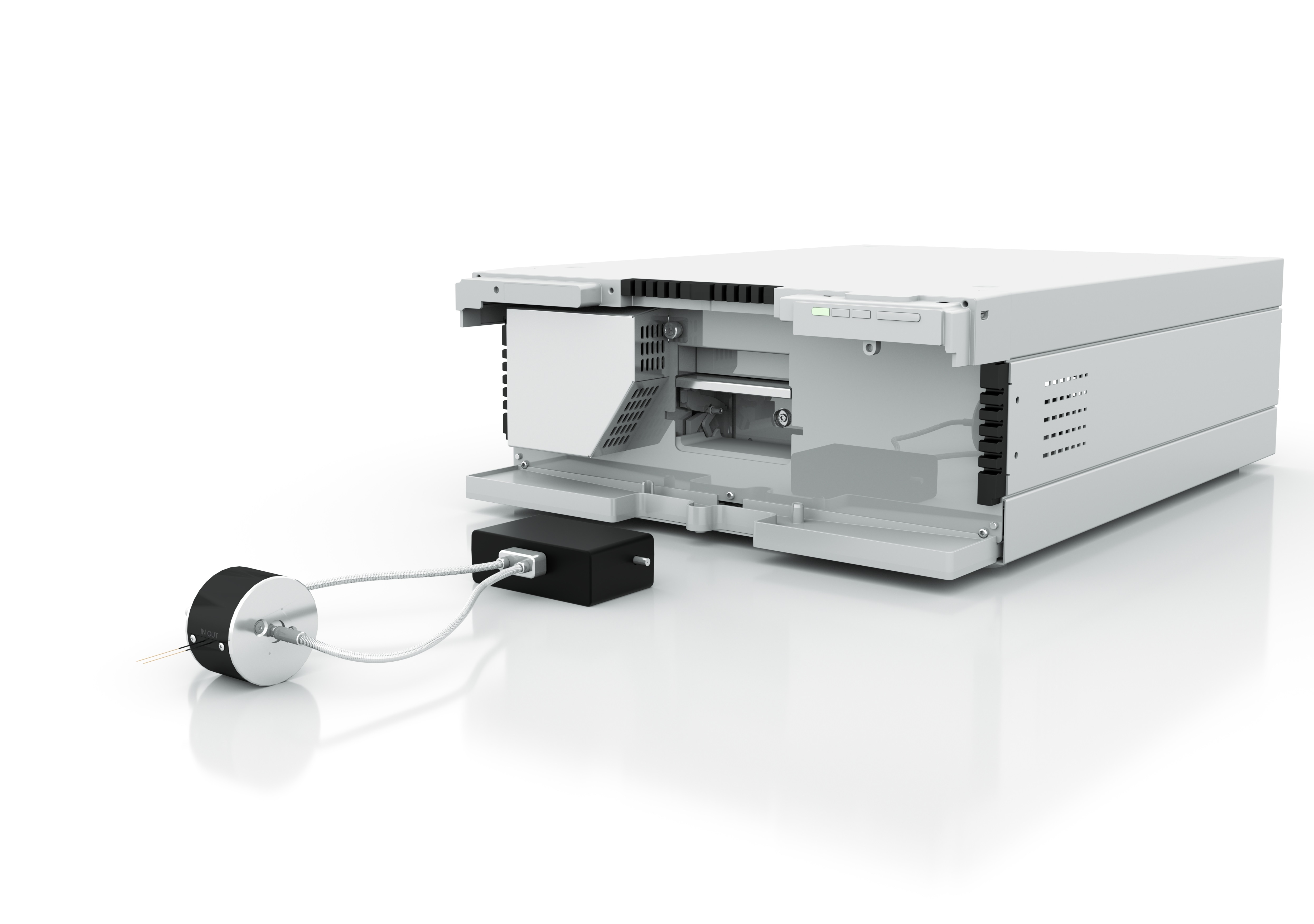 The KNAUER fiber optics technology allows the nano flow cell to be spatially separated from the detector. This allows the flow cell to be placed at an optimal position within the nano-LC or micro-LC system. By placing the flow cell directly at end of the column minimizes extra column volume, which improves peak sharpness as well as the separation. This makes the nano flow cell ideal for nano-LC-MS, which today is often carried out without additional UV detection, due to bad peak shape.