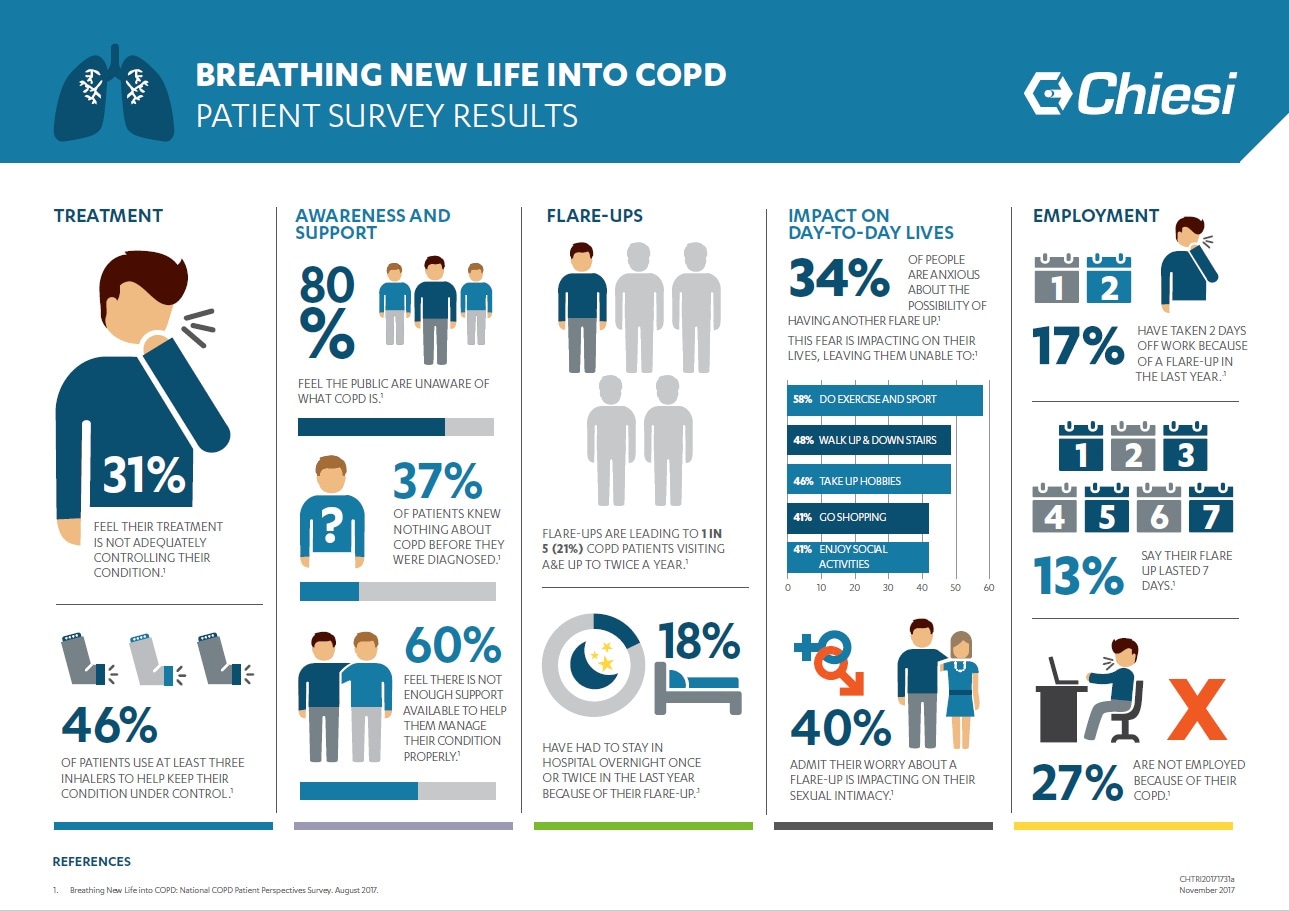 The‘Breathing New Life into COPD’ survey of 500 people across Britain diagnosed with chronic obstructive pulmonary disease (COPD) - the collective term for conditions such as chronic bronchitis and emphysema – found that almost a third (31 per cent) feel their treatment was not adequately controlling their condition.60 per cent feel there is not enough support available to help them manage it properly.