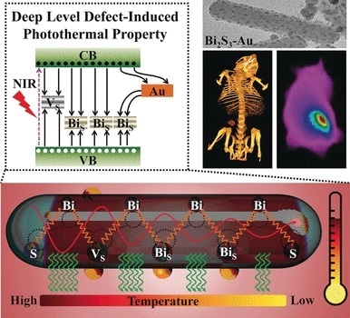 In Bi2S3 nanomaterials, which are synthesized in an excess of Bi and a shortage of S, the lattice will have locations with missing sulfur atoms or places in which a Bi replaces an S. Both of these can act as deep defects. Increasing the number of deep defects or increased introduction of electrons to these deep defects could increase the photothermal efficacy of Bi2S3 nanomaterials. This is where the gold atoms play a role. Gold atoms bind sulfur atoms and keep them out of their lattice positions. This results in more defects. In addition, the contact points between the Bi2S3 and gold provide the excited electrons with an energy level that allows them to return more easily to the energy level where there are substitution errors, allowing the electrons to fall more easily into the deep defect “trap”.