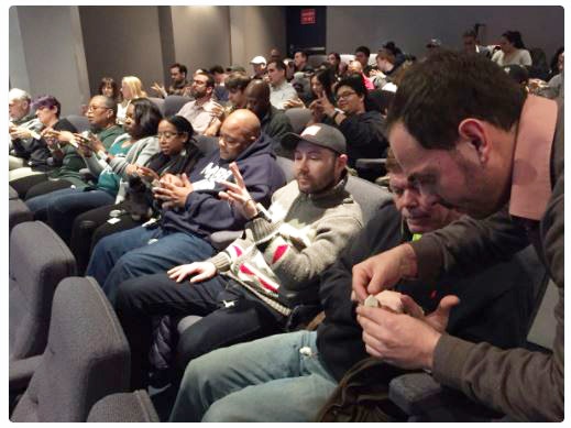 The sensors measured the galvanic skin response (GSR) of participants then wirelessly transmitted the data to a server which processed the data to generate a quick, read on the whole audience’s responses.