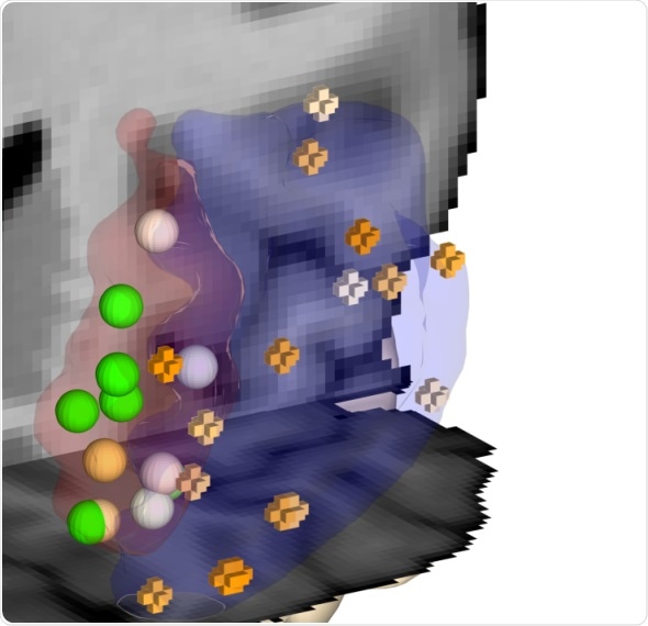 The medial frontal pole (red) is affected in major depression. JuGEx allows to locate gene expression data from tissue samples (colored spheres) ©Forschungszentrum Jülich / HBP