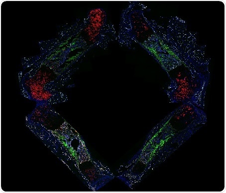 Sections of right and left hindlimb skeletal elements (femora and tibiae) from ePit-Col-p21 embryos expressing p21 preferentially in the left cartilage (right side of image). Red= tdTomato, Green= calcein, White= CD31 staining, Blue= DAPI. Femur and tibia from each side were relocated, rotated and stitched together digitally. Image Credit: Alberto Roselló-Díez