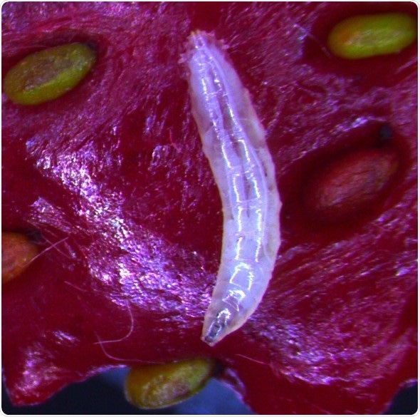 A Drosophila third instar larva feeds on a strawberry. Macronutrients such as sugar are vital for fruit flies during the larval stage of development where they increase their weight up to several hundred-fold in a matter of days. Credit: Hubert Amrein, [email protected]