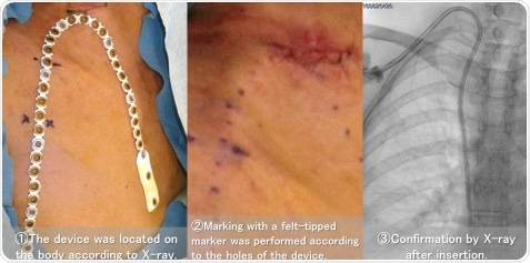 The insertion support device was tested on 10 Japanese adult hemodialysis patients (6 men and 4 women with a mean age of 71.3 years) treated at Shigei Medical Research Hospital.  Placement of the device on the body took place with the help of X-ray imaging: the tip of the device, for marking the TCC entry site, was laid so that it overlaps with the right heart border.  With the help of the markings made on the patient’s body, the physician could insert the TCC within an error of about 1 cm.  The patients were observed for 2 months, during which there was no catheter replacement needed.