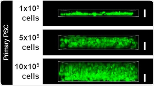 Increasing the number of PSCs resulted in an increasing thickness of the desmoplastic layer, as seen by the green signal (white bar denotes 10 micrometers). This replica of patient tissue samples was used as the 3D model to investigate pathways driving pancreatic cancer.