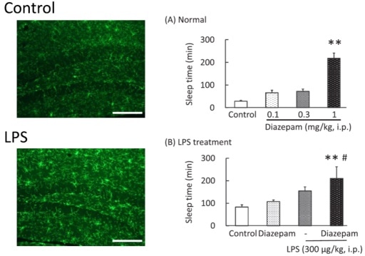For their study, the investigators first artificially stimulated GABAR in the brains of mice, using a sedative called pentobarbital. As expected, pentobarbital induced a loss of the righting reflex (LORR). Under normal conditions, BZDs should prolong the duration of the LORR, as they activate GABAR even further. This was observed with a high, but not low, dose of the BZD, diazepam. Another group of mice was then treated with a bacterial endotoxin that triggered inflammation in their brains. When this group was given diazepam, it prolonged the duration of LORR even at a low dose, suggesting a sensitivity to diazepam in the inflammation-induced mice.