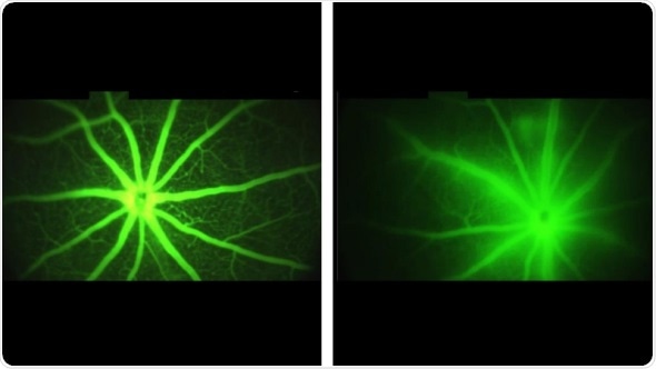 The researchers next wanted to see if the same effect could be achieved in living blood vessels. They used a fluorescent dye to observe the blood vessels in the eyes of normal mice and mice genetically engineered to mimic human macular degeneration. In the healthy mice, the researchers observed glowing blood vessels with crisp edges and very little fluorescence outside of the vessel. However, in the mice with macular degeneration, glowing liquids passed through the blood vessels, blurring the barrier between blood vessels and the surrounding tissues.