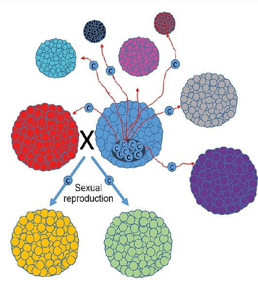 Not only did first multicellular organisms have to deal with their own cheater cells, they also had to evolve adaptations to prevent them being colonized by foreign malignant cells (i.e. infectious ones). Because asexual reproduction leads to identical (“clonal”) organisms, this mode of reproduction is risky due to the possibility of being invaded by clonal infectious cell lineages (i.e. transmissible cancers). Conversely, sexual reproduction decreases the compatibility of contagious cancer cells with their hosts, limiting individual infection risk, as well as the risks of transmission between parent and offspring. Sexual reproduction also generates genetic variation that facilitates the detection of foreign cells, the first and critical step of immune protection.
