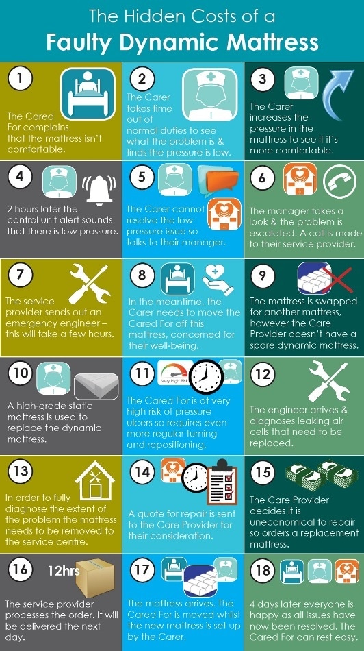 We’ve thought about these ‘hidden costs’ and created a possible scenario. This might be something you recognize, although we think we’ve probably over simplified the process! When a mattress is faulty it certainly requires involvement and time from the Care Provider and Carer. Probably, more importantly, it causes inconvenience and stress for the Cared For. Potentially it could also impact on the managers, directors, owners, handyman, housekeeper, administrators etc. This all adds up to a more complex and expensive picture than initial purchase price alone.