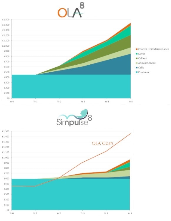 Taking our data from the last few years we have analyzed the performance and costs to work out the average lifecycle costs for OLA 8 and Simpulse 8, over a 5 year period.