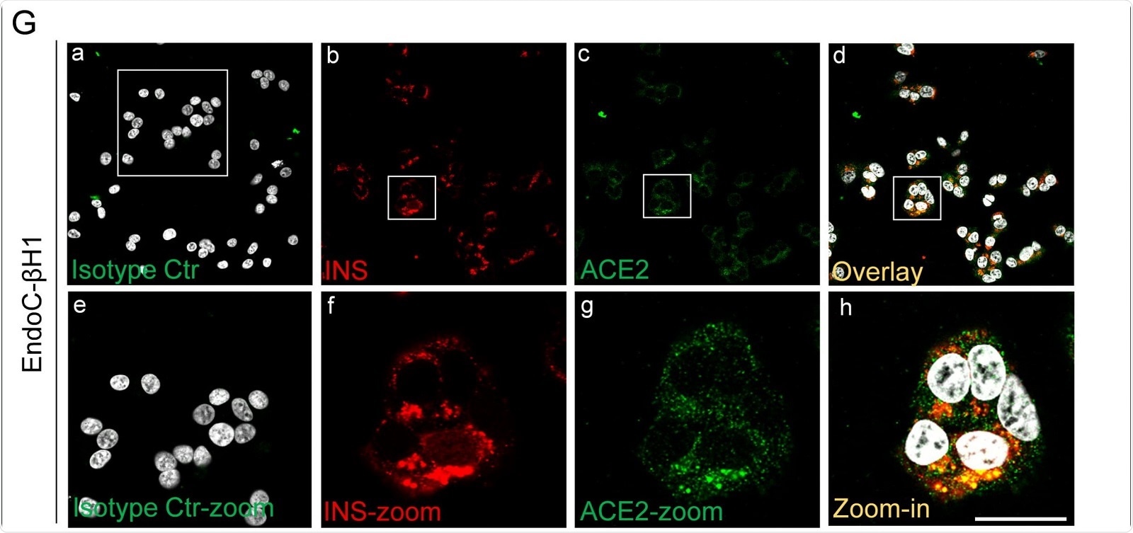 ACE2 and insulin double immunofluorescence analysis in EndoC-βH1 cultured cells. Negative isotype primary antibody control (relative to ACE2 primary antibody) is shown in panel-a. Insulin (red) and ACE2 (green) are reported in panel-b and -c, while overlay is reported in panel-d. Zoom-in images are reported from panel-e to -h. Scale bar in panel -h = 15 µm