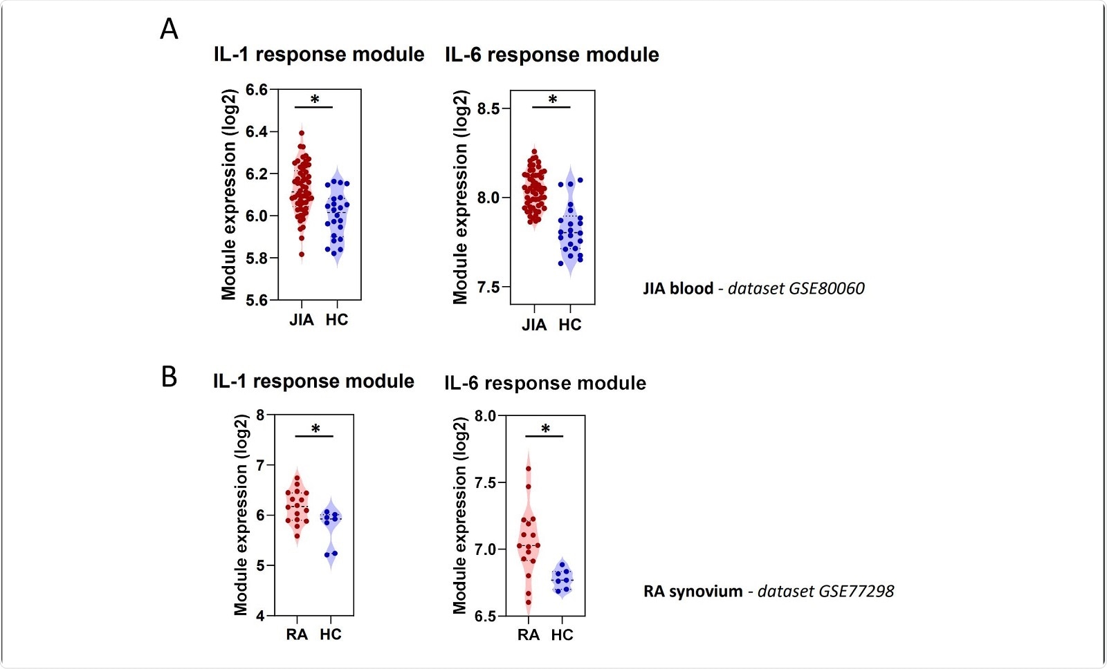 Cytokine response module expression in chronic inflammatory conditions. Geometric mean expression of IL-1 and IL-6 cytokine response modules in A) blood of patients with JIA compared to healthy controls, and B) in the synovium of RA patients compared to that of healthy controls. Transcriptomic datasets are designated adjacent to figure panels. * = p < 0.05 by Mann-Whitney test.
