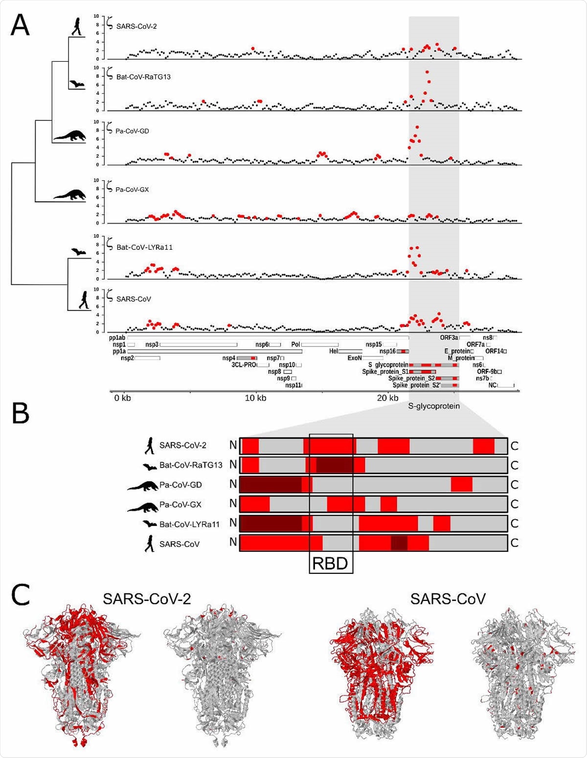 To investigate mutations in coronaviruses,  a new study by scientists at Duke University and published on the preprint server bioRxiv*,  used a computational methodology, adaptiPhy, which identifies extra nucleotide substitutions in certain parts of the viral genome compared to mutations that have no effect on the genome. Using adaptiPhy, the team identified regions of genomes of different Sarbecovirus species from bat, pangolin, and human hosts, which could have been positively selected, or advantageous mutations. For the novel SARS-CoV-2 coronavirus, they used about 5000 genome sequences from the NCBI Virus database.