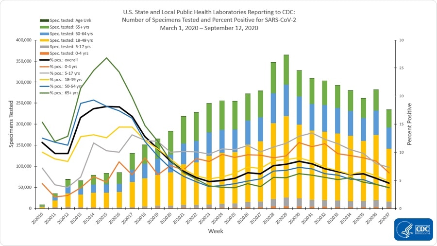 The United States has reported the highest number of coronavirus disease cases (COVID-19), with more than 6.88 million infections since the start of the pandemic. Now, eight months into the pandemic, caused by the severe acute respiratory syndrome coronavirus 2 (SARS-CoV-2), the U.S. Centers for Disease Control and Prevention (CDC) reports a decreasing percentage of respiratory specimens testing positive for the virus.