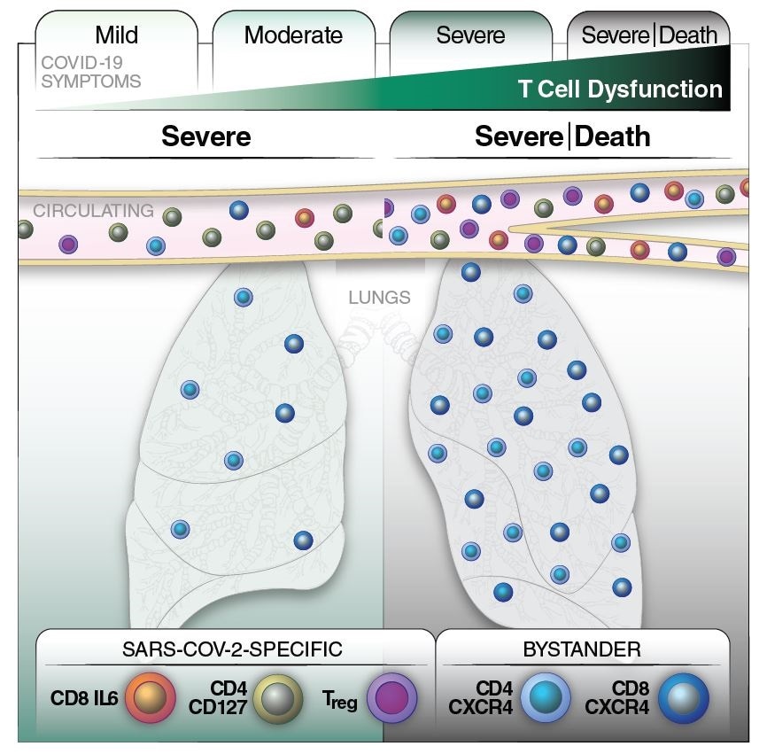When all results are taken into account, this study represents a model in which lung-homing T cells activated via bystander effect contribute to immunopathology, whereas a non-suppressive and robust SARS-CoV-2-specific T cell response controls pathogenesis and stimulates recovery from severe COVID-19.