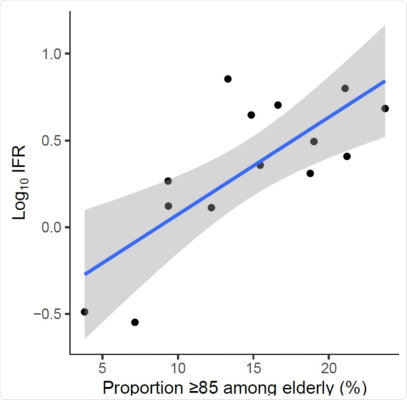 Infection fatality rate, corrected for unmeasured antibody types, plotted against the proportion of people ≥85 years old among the elderly. Log10 IFR: logarithm (with base 10) of the infection fatality rate. The “elderly” group is defined by the primary cutoff for each location. E.g. for Belgium 3% of the population is ≥85, and 13.6% of the population is ≥70, thus the proportion is 3/13.6. Imputation done for regional data: Denmark (3/5 regions), and Tamil Nadu, India, with country-level proportion of persons ≥85 years old among elderly.