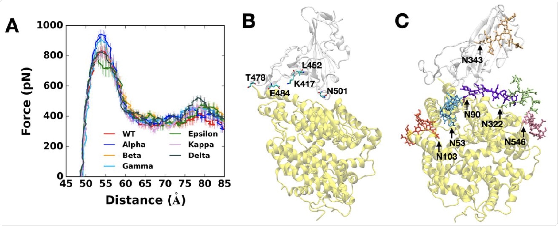 The researchers modeled the pulling force on the fully glycosylated spike RBD-ACE2 model. Most variants showed high force profiles compared to the WT virus, except for the epsilon variant., thus indicating that these variants bind more strongly to the receptor than the parental strain.