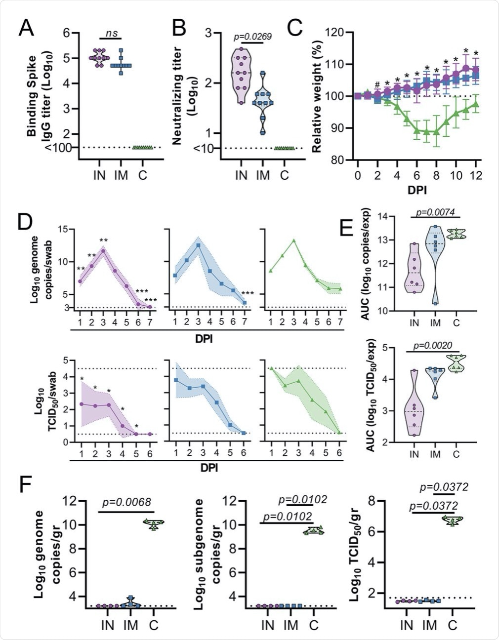 Hamsters (n=10 per group) were vaccinated via the IN route (purple), IM route (blue) or with control (C) vaccine ChAdOx1 GFP via the IM route (green). (A) Binding antibody titers against SARS-CoV-2 S protein in serum are shown for day 28 post-vaccination. (B) Virus neutralizing antibody titers in serum are shown for day 28 post-vaccination. For (A and B), the geometric mean and 95% confidence interval are shown. Dotted line = limit of detection.(C) Relative weight was measured as a percent of starting weight at indicated days post-inoculation (DPI) with SARS-CoV-2. #p<0.05 between IN and control group; *p<0.05 between vaccinated groups and control group. Geometric mean and 95% CI are shown. (D) Viral load and viral titer in oropharyngeal swabs are shown as geometric mean (symbols) and 95% confidence interval (shade). *p<0.05; **p< 0.01; ***p< 0.001 relative to controls at the same time point. Dotted line = limit of detection. (E) Area under the curve (AUC) analysis is shown for viral load and titer detection in oropharyngeal swabs over 7 days post-inoculation. (F) Viral load and titer in lung tissue isolated at 5 DPI are shown. For (E and F), the dashed line within the violin plots indicates median; dotted lines within the violin plot indicate quartiles. Statistical analyses were done using mixed-effect analyses (C), two-way ANOVA (D), or Kruskal-Wallis test (E and F).