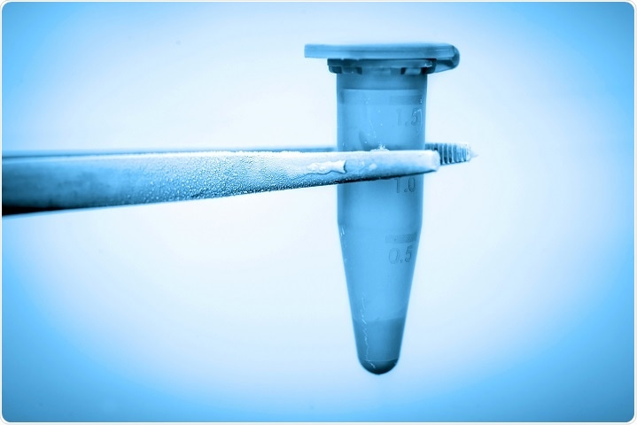 Cryopreserved sample held with tweezers. Image credit: AMS Bio