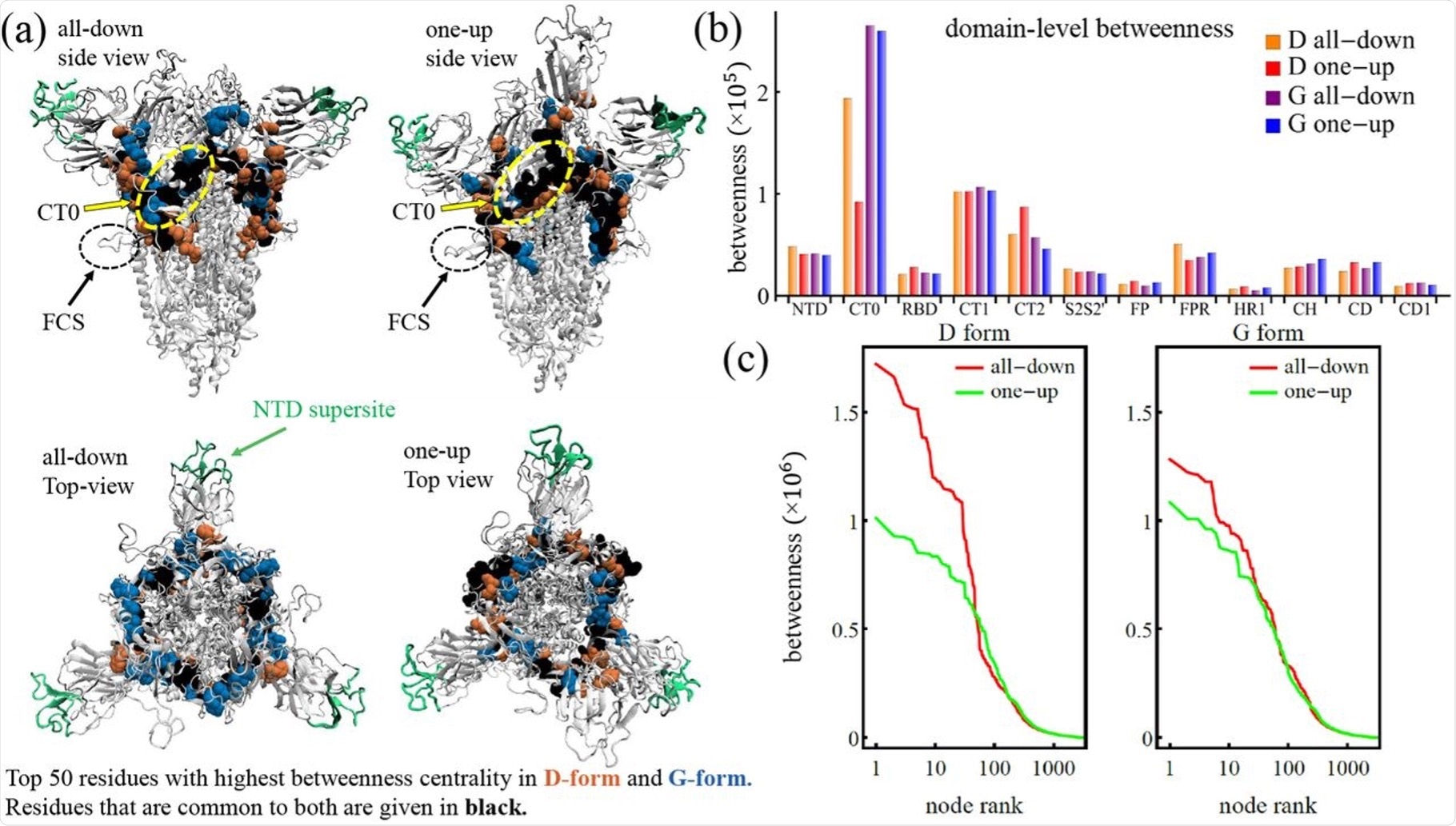 The communication core of the spike protein. (a) Spike protein with NTD supersite highlighted and top 50 residues of the D and G forms. (b) Domain level betweenness broken down to D and G form. (c) Individual residue betweenness centrality.