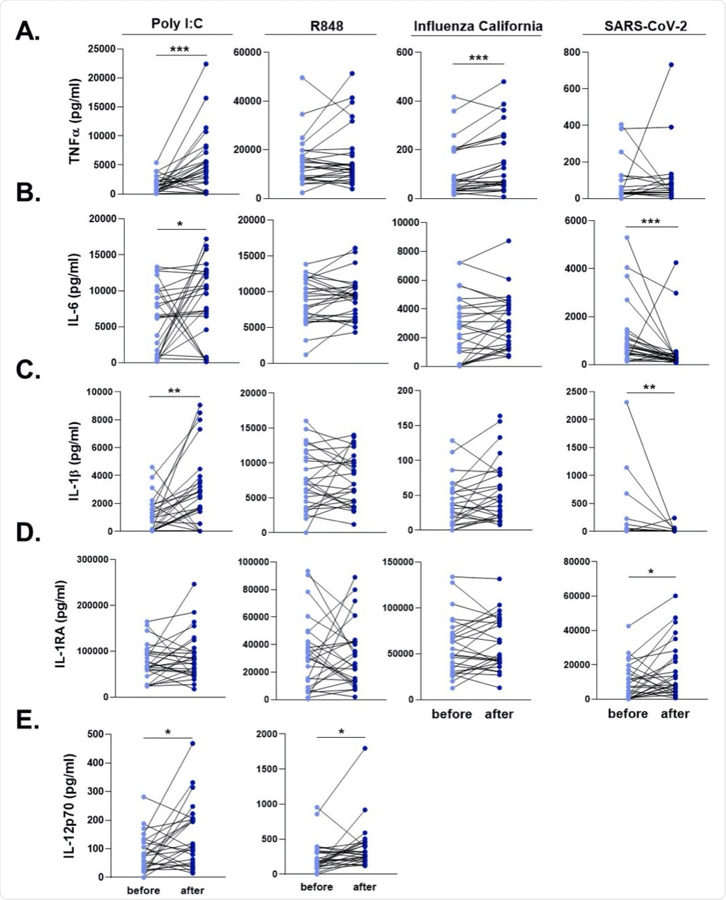 PBMCs were stimulated with heat-killed Influenza H1N1 (California strain), heat-killed SARS-CoV-2, poly I:C, and R848 for 24 hours. A. TNFα, B. IL-6, C. IL-1β, D. IL-1RA, and E. IL-12 responses were quantified. SARS-CoV-2 and Influenza stimulations did not lead to detectable levels of IL-12. Wilcoxon signed-rank test was performed to compare the differences in cytokine production between before and after influenza vaccination. Light blue dots represent the cytokine values before vaccination, while dark blue dots show after vaccination. n=28 *p<0.05, **p<0.01, ****p<0,0001.