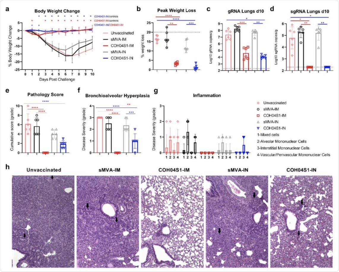COH04S1-mediated vaccine protection in hamsters following sub-lethal SARS-CoV-2 challenge. a. Body weight change. Bodyweight of COH04S1-IM and COH04S1-IN-vaccinated animals as well as unvaccinated and sMVA-IM and sMVA-IN vector control animals was measured daily for 10 days post-challenge. Weight loss is reported as mean ±SD. Two-way ANOVA followed by Tukey’s multiple comparison test was used to compare group mean values at each timepoint. b. Maximal weight loss. Percentage of maximal weight loss is shown in single animals of vaccine and control groups. Lines and bars represent median values and 95% CI, respectively. The dotted line represents the maximum weight loss allowed before euthanasia. Peaks of weight loss in each group were compared using one-way ANOVA followed by Tukey’s multiple comparison test. c-d. Lung viral loads. SARS-CoV-2 genomic RNA (gRNA) and sub-genomic RNA (sgRNA) copies were quantified in lung tissue of vaccine and control groups at day 10 post-challenge by qPCR. Bars show RNA copies geometric mean ± geometric SD. Dotted lines represent a lower limit of detection. Kruskal-Wallis test followed by Dunn’s multiple comparison test was used. e-h. Histopathological findings. Hematoxylin/eosin-stained lung sections of COH04S1-vaccinated hamsters and control animals at day 10 post-challenge were evaluated by a board-certified pathologist and microscopic findings were graded based on the severity on a scale from 1 to 5 (Table S2). Panel e shows the cumulative pathology score of all histopathologic findings in each group. Panel f shows grading of bronchioalveolar hyperplasia disease severity in each group. One-way ANOVA followed by Holm-Sidak’s multiple comparison test was used. Panel g shows the severity of lung inflammatory microscopic findings based on 1-to-5 scaling of four inflammation types as indicated. Bars in e-g represent mean values ±SD. One-way ANOVA followed by Tukey’s multiple comparison test was used. In b-f *=0.05 < p <0.01, **=0.01 < p < 0.001, ***=0.001 < p < 0.0001, ****=p < 0.0001. Panel h shows representative images of histopathological findings in lung sections of COH04S1-vaccinated animals and control animals. Black arrows indicate moderate and mild bronchioalveolar hyperplasia in lung sections of sMVA-IM and sMVA-IN control animals as well as COH04S1-IN animals. Black arrows in lung sections of unvaccinated control animals indicate hyperplastic alveolar cells. 10x magnification.